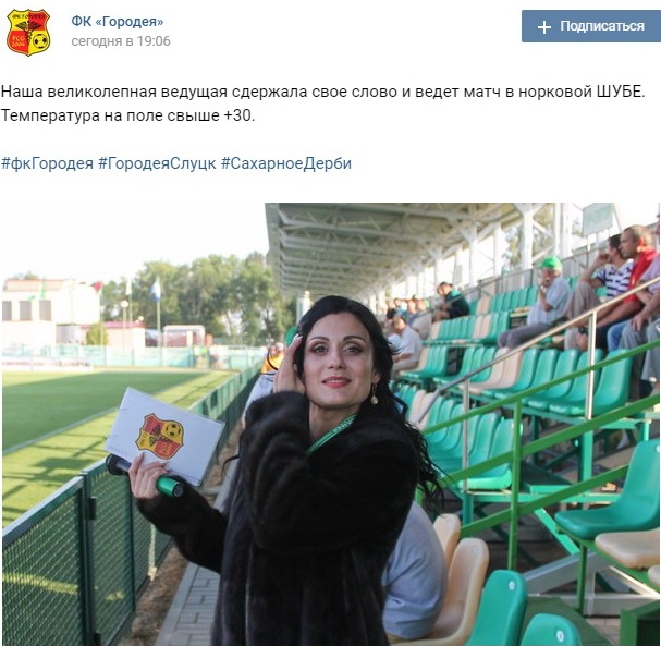 Фотофакт. Ведущая “Городеи“ отработала на матче в норковой шубе в 30-градусную жару