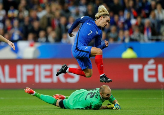На 27-й минуте Гризманн вышел один на один и пробил белорусского кипера – 0:1. Через шесть минут срезку Драгуна использовал и сумел отличиться один из лучших снайперов французской сборной Жиру – 0:2. Казалось, белорусов ждет разгром. Но этого не произошло. На 44-й минуте красивую комбинацию сборной Беларуси завершил Сарока – 1:2.