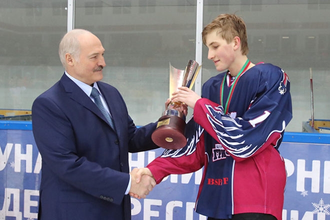 За команду «Грифоны» играет младший сын Лукашенко Николай — он лучший бомбардир соревнования. В фотоотчет пресс-службы президента попал кадр, где Александр Лукашенко передает кубок сыну. При этом в подписи под фото не указано, что на снимке сын главы страны.