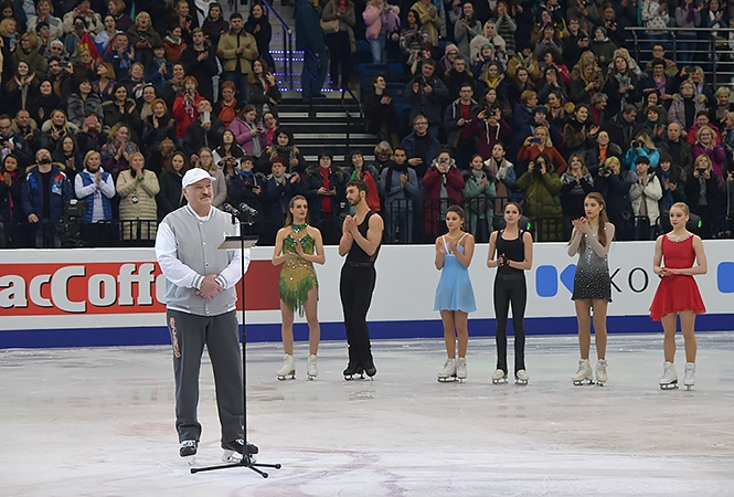 "Выходя на лед "Минск-Арены", я прежде всего подумал о мужестве. Всю жизнь простояв на льду на коньках и делая первые шаги вот так вот, незащищенным, я обнаружил какой-то страх и подумал: а как они, раздетые, полуголые, прыгают, вертятся, крутятся, такие выписывают фигуры? Не хоккеисты самые мужественные люди, а они!" - заявил Александр Лукашенко 27 января, посещая гала-представление чемпионата Европы по фигурному катанию в "Минск-Арене".