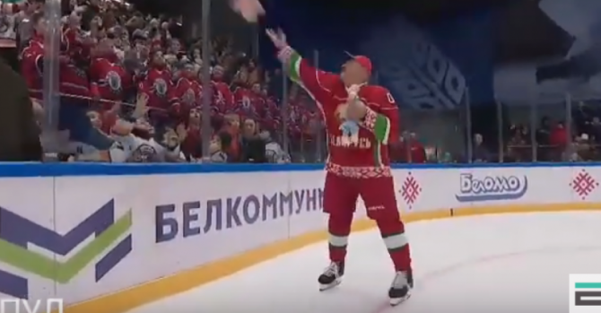 Лукашенко швыряет игрушку через ограждение хоккейной площадки