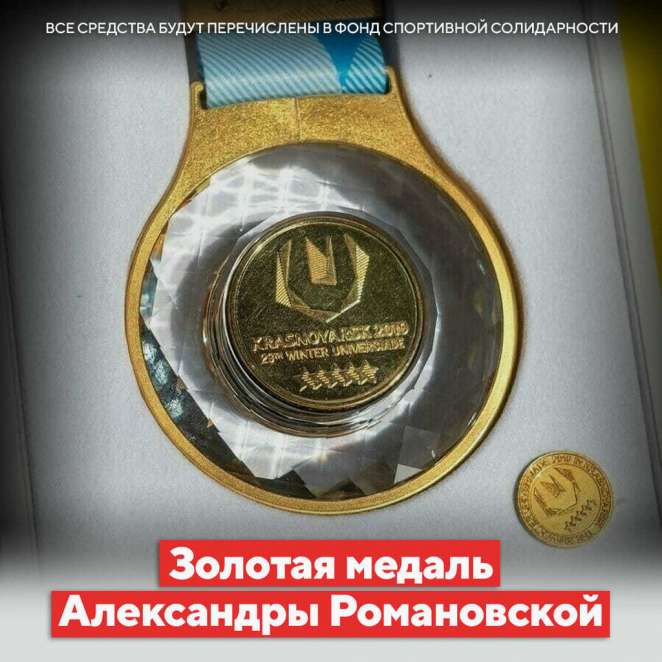 В качестве лота представлена золотая медаль, которую спортсменка завоевала на зимней Универсиаде-2019 (тогда Александра выполнила один из сложнейших элементов — тройное сальто и получила за него 100,29 балла).
