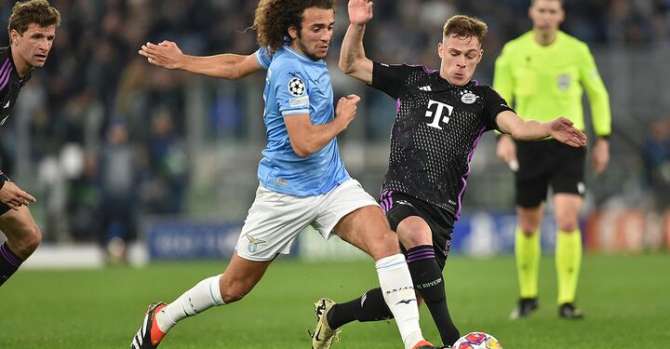 Маттео Гендузи из «Лацио» борется за мяч с Йозуа Киммихом из «Баварии» в матче Лиги чемпионов, Рим, Италия, 14 февраля 2024 года. Фото: Reuters
