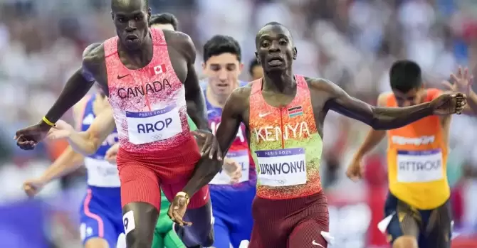 Кениец Эммануэль Ваньоньи (слева) побеждает канадца Марко Аропа на дистанции 800 метров на Олимпийских играх в Париже. Фото: AP Photo / Petr David Josek