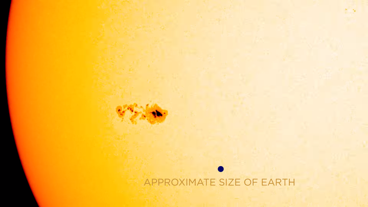 На видео пятно выглядит небольшим в сравнении со всем Солнцем, NASA сравнивает его с веснушкой. Однако темная область больше, чем вся Земля. Синяя точка на видео — это приблизительный размер нашей планеты.