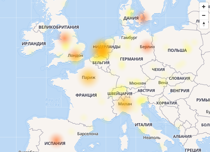 Судя по информации Downdetector, больше всего жалоб поступает от пользователей из Нидерландов и Великобритании, проблемы с доступом также наблюдаются, например, в России, Германии и Италии, других странах Европы, а также в США.