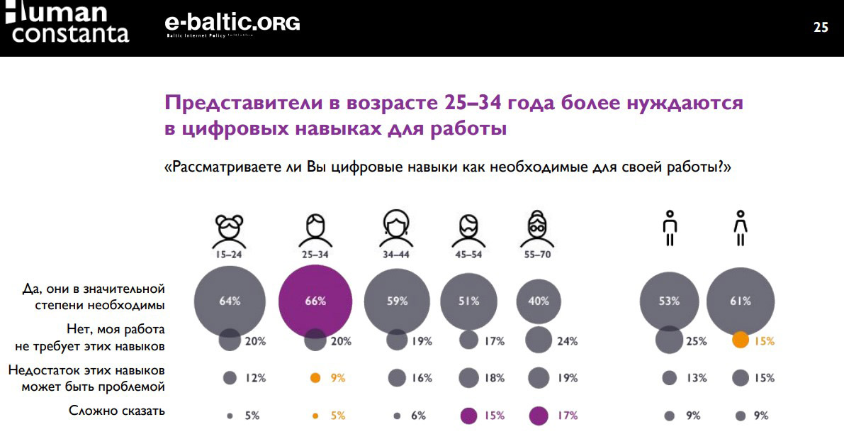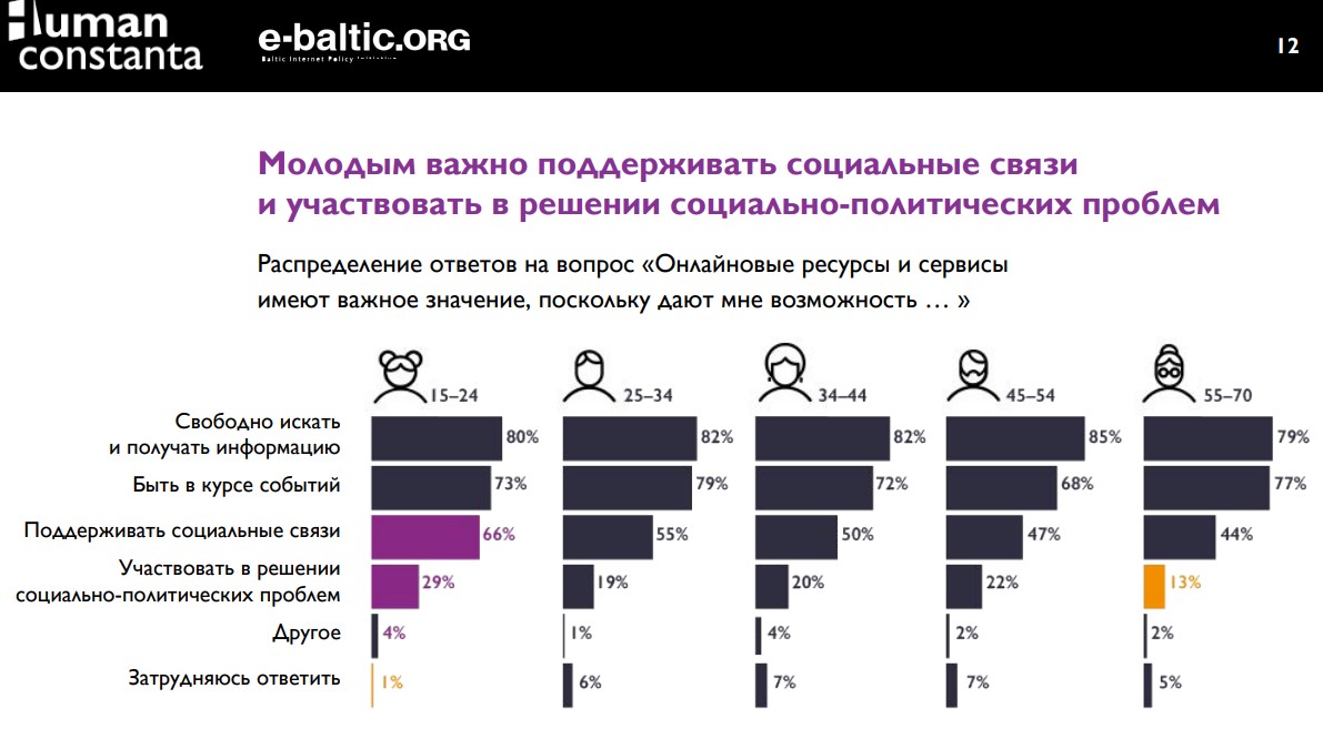 — Старшая возрастная группа 55-70, хоть она и очень большая в генеральной совокупности населения, меньше, по сравнению с молодой аудиторией, использует интернет. При этом критическое мышление не является сильным навыком представителей этой группы. Так как цифровая компетенция связана с медиаграмотностью, получается, что эти люди используют достаточно регламентированные источники информации. При этом среди них низок процент заинтересованности в повышении цифровых навыков. Это серьезный вызов, − считает исполнительный директор Baltic Internet Policy Initiative Михаил Дорошевич.