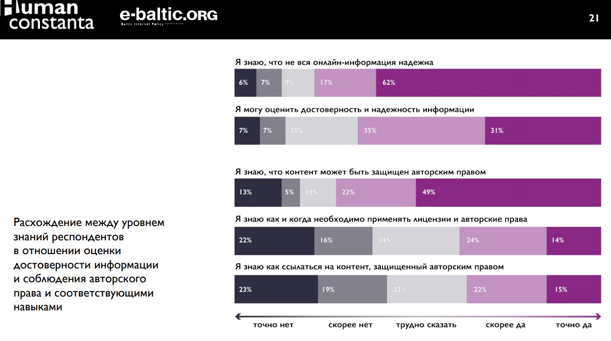 В то же время пользователи интернетом из Беларуси имеют лишь базовые «цифровые» компетенции. Это подтверждает количество тех, кто в разных вопросах выбирал вариант «затрудняюсь ответить» — в среднем таких было 15-25%. Скорее всего, это означает, что люди просто не понимали суть вопроса, считает академический директор Baltic Internet Policy Initiative.