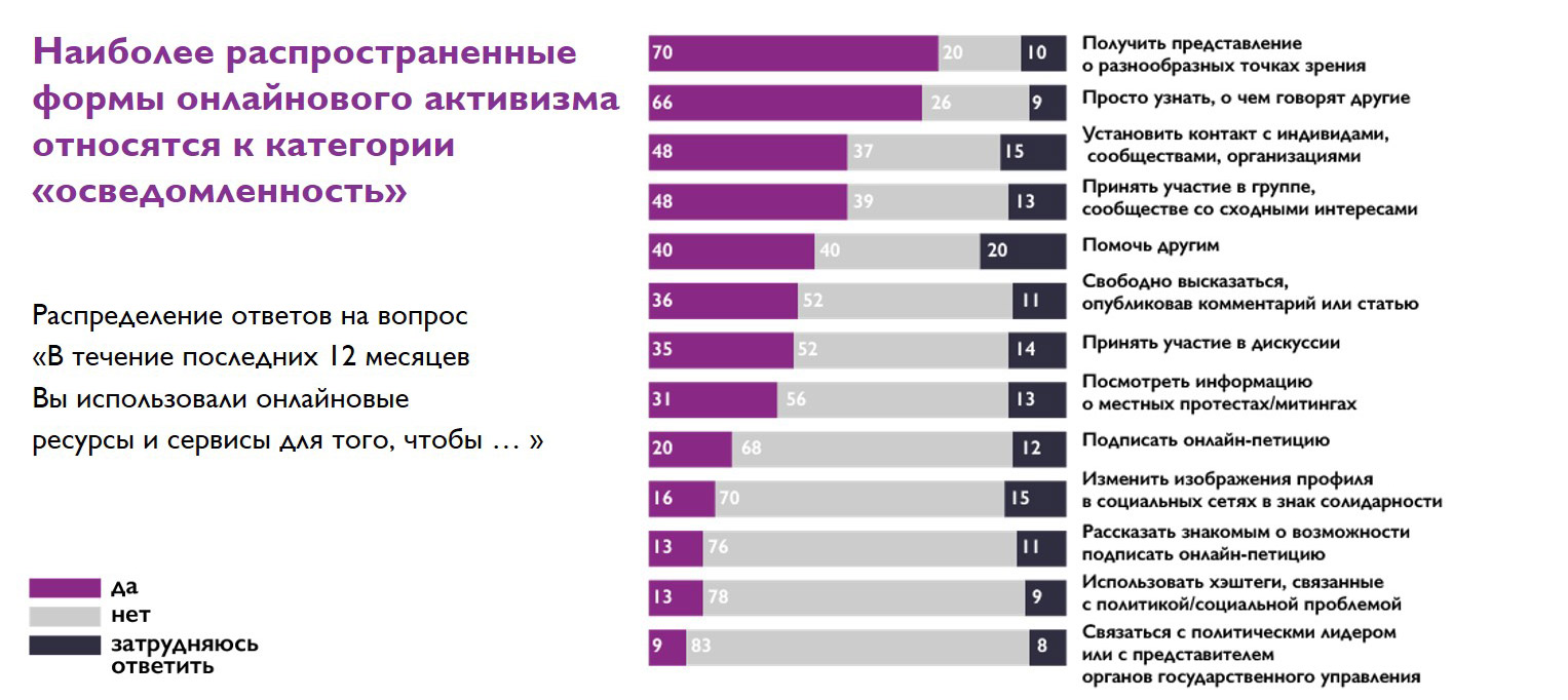Две трети респондентов за последний год использовали интернет в основном для получения какой-либо информации, но только чуть больше трети пользовались возможностью высказать свою точку зрения или подискутировать. При этом большинство имеют только базовые навыки создания контента и общения онлайн. И это, по мнению авторов, ограничивает возможности для онлайнового активизма. Тем не менее подписывали петиции онлайн или как-то еще помогали людям в последнем году 20% и 40% соответственно.