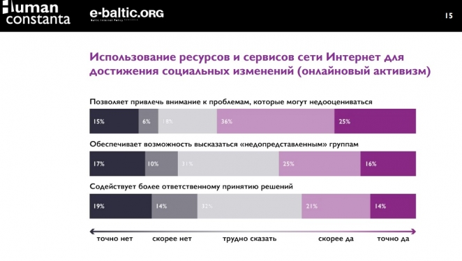 − Из результатов опроса следует, что люди не активно включаются в различные кампании, потому что, во-первых, не знают, как это сделать, во-вторых, не особенно доверяют, − комментирует академический директор Baltic Internet Policy Initiative Марина Соколова.