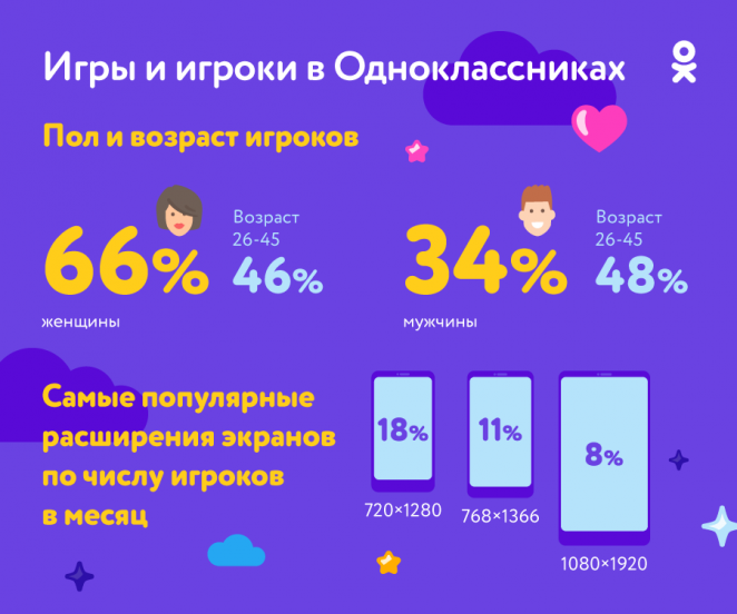 Кроме того, по данным исследования ОК, женщины играют чаще, их доля от общего числа игроков — 66%. Самую многочисленную (46% всех игроков-женщин) категорию составляют женщины 26-45 лет. Из 34% играющих в ОК мужчин также преобладают люди от 26 до 45 лет, они составляют 48% от всех играющих мужчин.