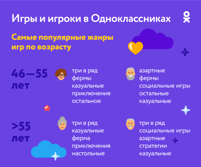 Одноклассники также проанализировали самые популярные жанры на игровой платформе. В ОК, где пользователи традиционно активно делятся эмоциями с родными и близкими, социальные механики игр (репосты, приглашения, соревновательность) делают их особенно успешными.