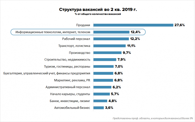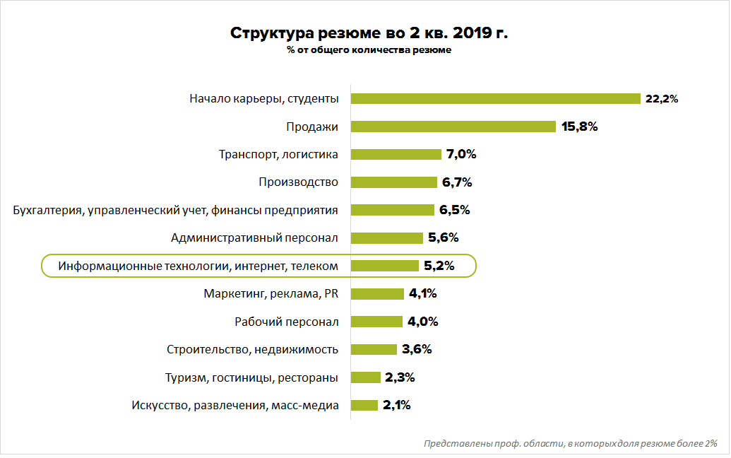 При этом по количеству резюме IT только на седьмом месте. В общей структуре соискателей их лишь 5,2%.