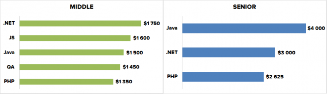 При этом зарплаты в IT остаются одними из самых высоких в стране. Медианная зарплата программиста уровня Middle составляет от 1350 до 1750 долларов в зависимости от специализации, а Senior’ов – от 2625 до 4000.