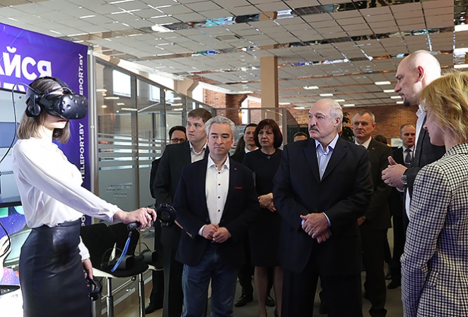 12 апреля 2019 года. Александр Лукашенко во время ознакомления с экспозицией разработок ведущих компаний, являющимися резидентами белорусского Парка высоких технологий. Фото: пресс-служба главы Беларуси