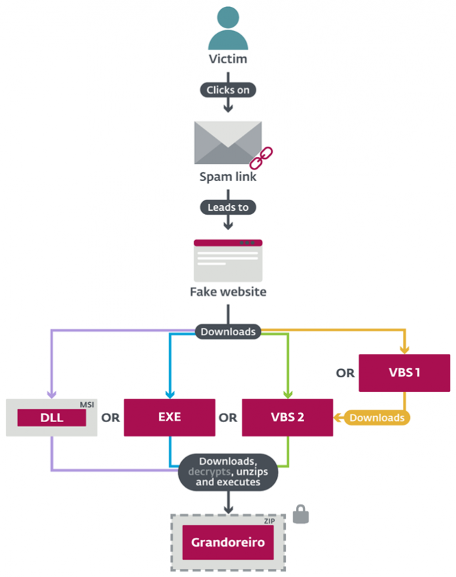 На рис. 1 представлены возможные пути распространения Grandoreiro. Окончательный ZIP-архив зашифрован и в некоторых случаях также защищен паролем.