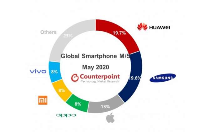 В мае доля Huawei составила 19,7 %, тогда как Samsung удалось занять 19,6 % отрасли. Таким образом, разрыв между компаниями совсем невелик, но Huawei удаётся сохранять лидерство в условиях санкций со стороны Соединённых Штатов, пандемии и сложной экономической обстановки в целом.