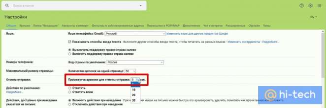 Нажмите на значок шестеренки в правом верхнем углу и выберите «Все настройки». Теперь найдите пункт «Отмена отправки» и выберите из выпадающего списка максимальное время 30 секунд. Вы, впрочем, можете поставить и другое значение, но разумнее всего будет установить именно максимальную задержку. Не забудьте сохранить изменения. Сделать это можно в самом низу страницы, нажав на соответствующую кнопку.