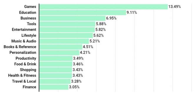 Статистика показывает, что игровые приложения были самой популярной категорией приложений в магазине Google Play во втором квартале 2020 года, составляя 13,49% доступных приложений. На втором месте оказались образовательные приложения с долей 9,11%. Далее следуют бизнес-приложения и инструменты с долями 6,95% и 5,98% соответственно. Наглядное представление о распределении приложений по категориям дает вторая диаграмма.