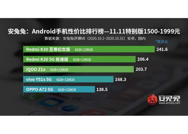 В список устройств по цене от $226 до $300 попали всего пять моделей, и опять-таки первые два места заняли устройства Redmi — Redmi K30 и Redmi K30 5G. Также в пятёрке оказались следующие модели: iQOO Z1x, vivo Y51s 5G и OPPO A72 5G.
