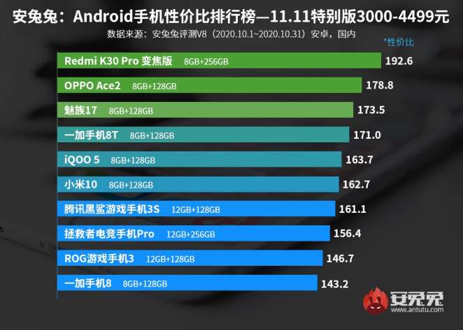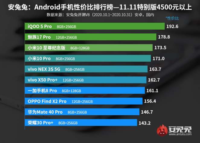 Среди самых дорогих смартфонов, чья стоимость превышает $675, цензоры AnTuTu поставили на первую строчку модель iQOO 5 Pro. Вторая позиция досталась Meizu 17 Pro, а замыкает тройку лидеров Xiaomi Mi10 Ultra с 8/128 ГБ памяти.