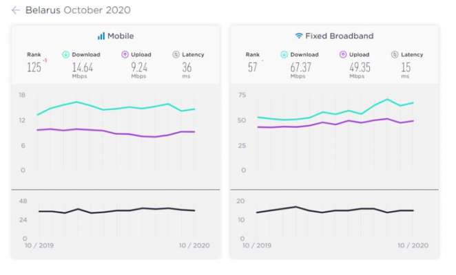 Согласно данным за август 2020 года, наша страна занимала 122-е место из 140 по скорости мобильного интернета (средняя скорость соединения составляла 15,91 Мбит/с).