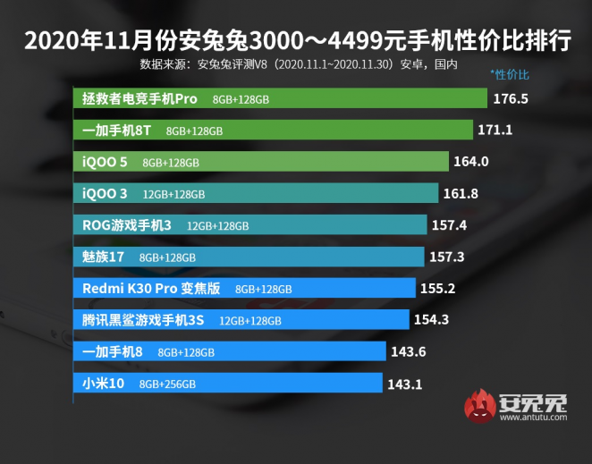 В списке устройств с розничной ценой $469 до $688 в топ-3 оказались Lenovo Legion Pro, One Plus 8T и iQOO 5.