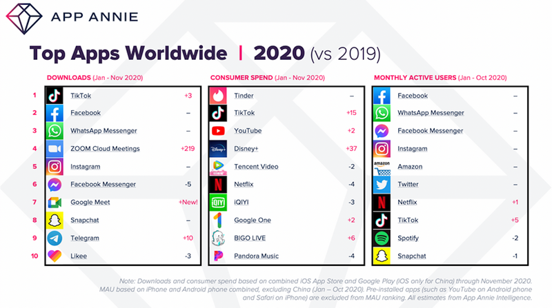 В тройку лидеров по количеству скачиваний также вошли Facebook и WhatsApp. Прорывом года стало приложение ZOOM для проведения видеоконференций, поднявшееся сразу на 219 позиций до четвёртого места в топ-10.