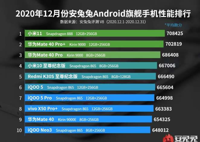 Пятёрку лидеров замыкает модель Redmi K30S с 8/128 ГБ памяти, лишь незначительно уступающая Mi10 Ultra. В первую десятку самых производительных Android-смартфонов декабря также попали три смартфона бренда iQOO, один гаджет vivo в лице флагманского X50 Pro+, а также базовая версия HUAWEI Mate 40 с чипом Kirin 9000E.