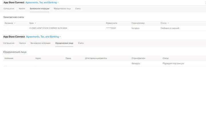 При этом, как пишет читатель, исходя из данных Аppstore connect (личный кабинет разработчика Apple), под санкции, о которых говорит корпорация, попадает именно юридическое лицо разработчика, а не банк, счет которого зарегистрирован в аккаунте.
