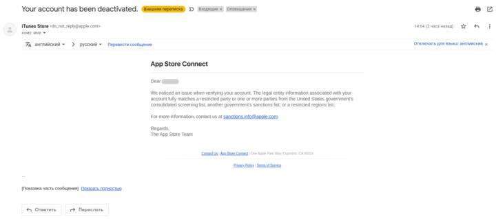 «Мы заметили проблему при подтверждении вашей учетной записи. Информация о юридическом лице, связанная с вашей учетной записью, полностью соответствует стране с ограниченным доступом или одной или нескольким странам из сводного контрольного списка правительства США, санкционного списка другого правительства или списка регионов с ограниченным доступом», — говорится в уведомлении от Apple.