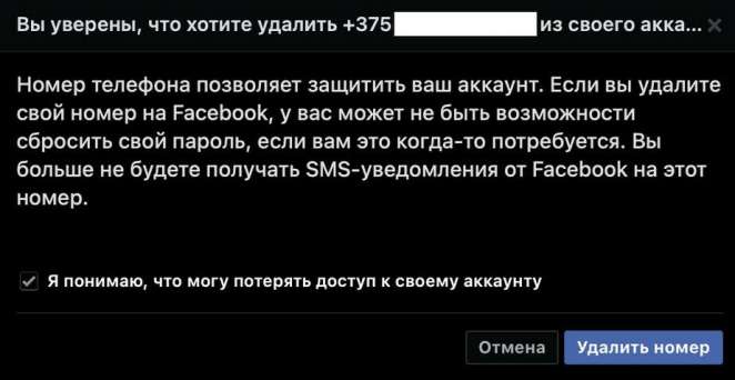 Нажмите «Удалить» под номером, который хотите убрать и выберите галочку «Я понимаю, что могу потерять доступ к своему аккаунту».