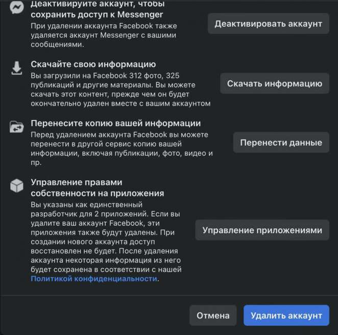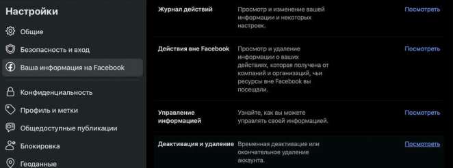 Нажмите «Ваша информация на Facebook», докрутите до пункта «Деактивация и удаление» и нажмите «Посмотреть».