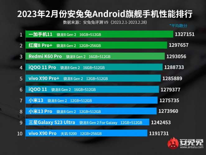 Первое место занимает OnePlus 11 с внушительным отрывом от второго места в лице Red Magic 8 Pro+. Тройку лидеров замыкает Redmi K60 Pro.