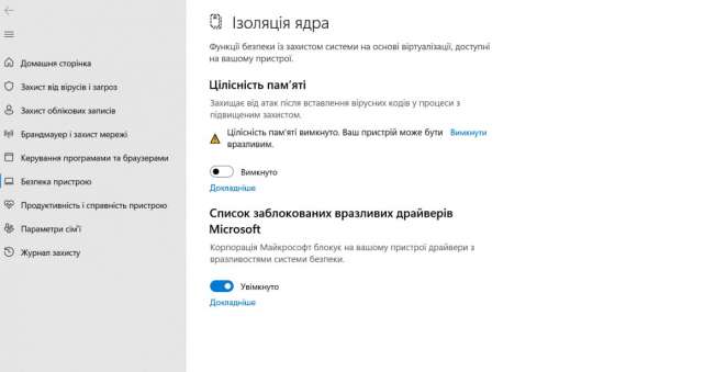 Аналогичные действия возможны через настройки системы. Открываем «Параметры», в поиске вводим «Изоляция ядра» и запускаем программу. В открывшемся меню отключаем параметр «Целостность памяти» (если она уже не была выключена) и перезагружаем ПК.