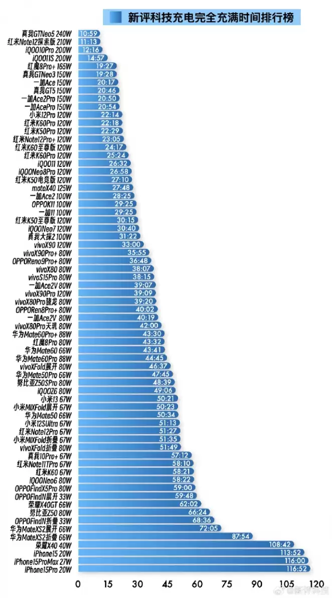 Победителем «гонки» стал GT Neo 5 от Realme, который поддерживает зарядку мощностью 240 Вт. Это самая быстрая зарядка в коммерческом смартфоне на сегодняшний день. Всего за 80 секунд набираются первые 20%, а полный заряд занимает 10:59 минут.