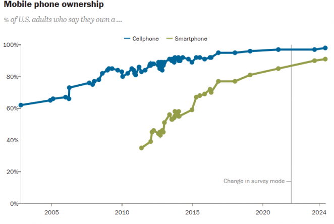 В среднем в 2024 году американцы тратили на смартфон 4 часа 30 минут в день, однако только 43,2% опрошенных признали, что чувствуют зависимость от мобильных устройств. Зумеры и миллениалы ожидаемо являются наиболее активными пользователями среди поколений и проводят за телефонами в среднем шесть часов в день, бумеры и «молчаливое поколение» тратят на смартфоны около двух часов в день. В целом смартфонами сейчас владеют 95% подростков в США, и эта доля постоянно росла в течение последнего десятилетия.