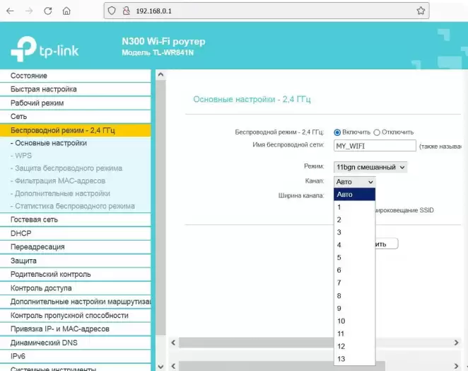 Во вкладке "Беспроводной режим" измените номер канала на 10, 11 или 12.