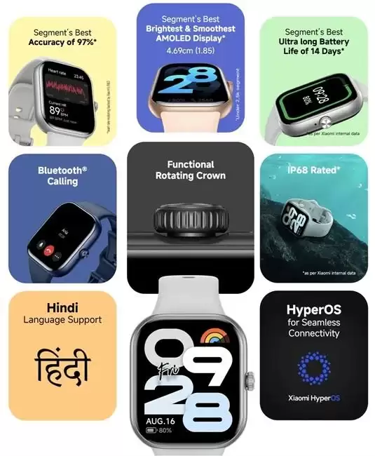 Умные часы работают под управлением HyperOS. Они умеют считать шаги и количество потраченных калорий, мониторят качество сна, уровень кислорода в крови, стресса и частоту сердечных сокращений с точностью 97%. Гаджет поддерживает свыше 140 режимов тренировок, также реализована функция звонков по Bluetooth.