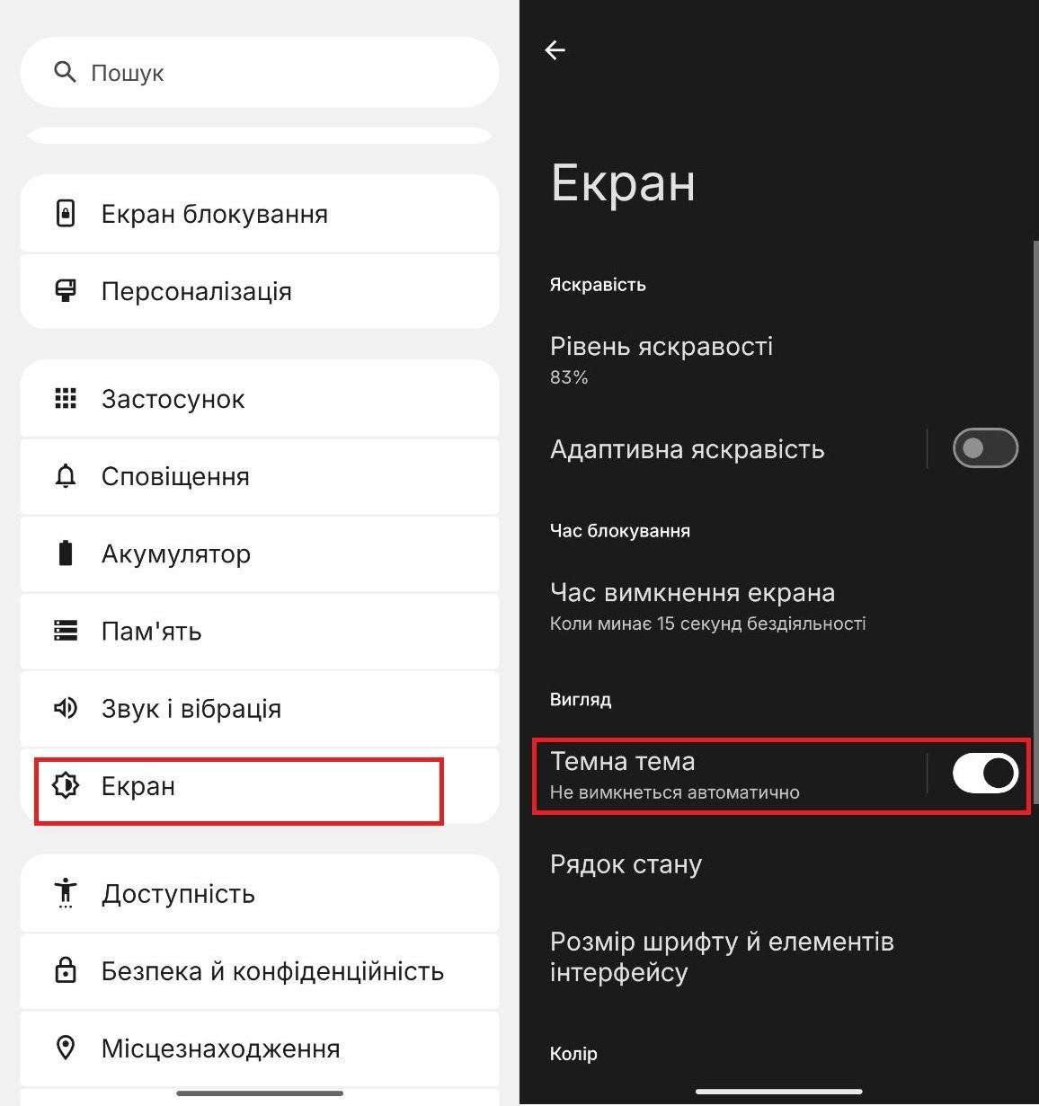 на Android: откройте "Настройки" → выберите "Экран" → включите параметр "Темная тема".