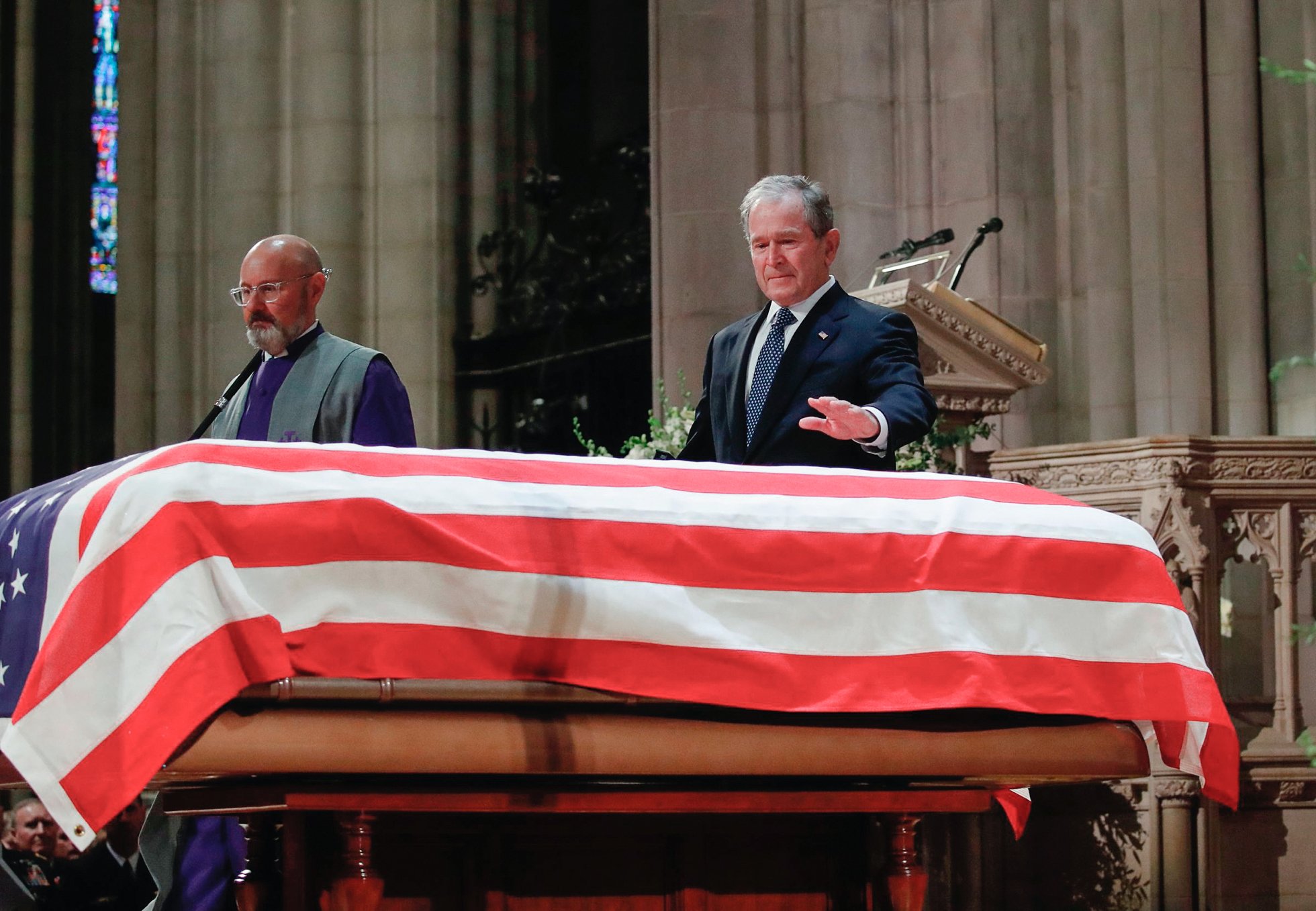 В Вашингтоне 5 декабря простились с 41-м президентом США Джорджем Бушем-старшим. В траурной церемонии, проходившей в Национальном кафедральном соборе, приняли участие пять президентов США, включая Дональда Трампа и Джорджа Буша-младшего. 43-й президент США, произнося речь у гроба отца, в частности заявил, что Буш-старший был «самым ярким среди тысячи огней». В конце выступления он не смог сдержать слезы. Фото: Alex Brandon / AFP / Scanpix / LETA