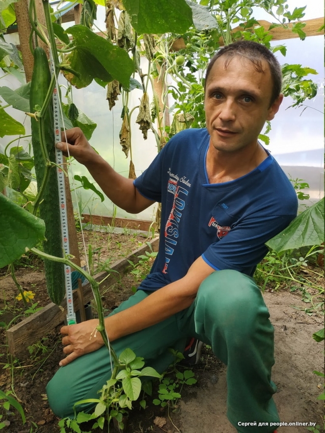 У Сергея из Калинкович огурец уже 72 см. И продолжает расти! Мужчина не смог оставаться безучастным, когда увидел публикацию в «Гродненской правде»: женщина там хвасталась огурцом в 42 см. Тогда мужчина с гордостью и достоинством показал свой 72-сантиметровый. Сергей подчеркивает: в его парнике висит именно огурец, а не модная лагенария. Калинковчанин не собирается срывать овощ и намерен продолжать эксперимент до победного конца, пока его огурец сам не отвалится.