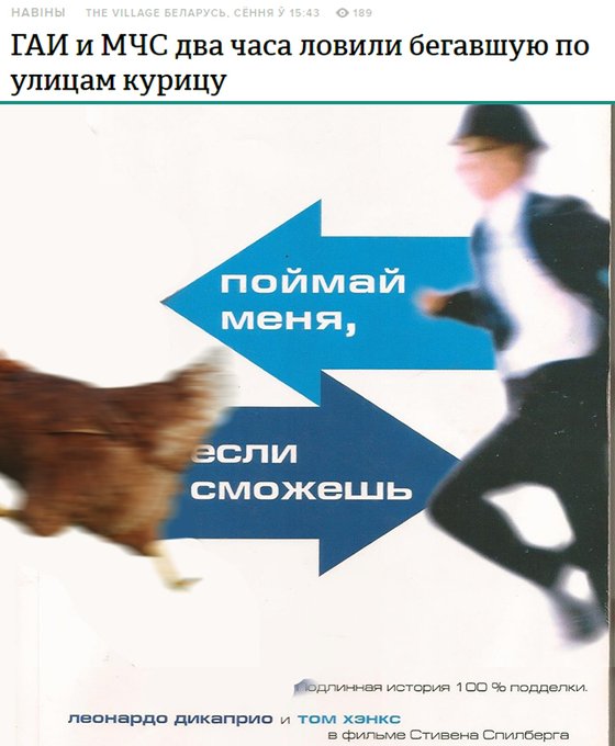 ГАИ и МЧС два часа ловили бегавшую по улицам Гродно курицу. Инициатором спасательной операции стал Станислав — небезразличный местный житель, обеспокоившийся тем, что курица выбегала на дорогу и могла спровоцировать аварийную ситуацию. Сначала мужчина пытался поймать курицу самостоятельно, но, отчаявшись, позвонил в МЧС и милицию. Те перенаправили в ГАИ. «Никто не хотел реагировать на мои звонки, все просто смеялись, — говорит Станислав. — Только после пятого звонка приехали сотрудники. Они сказали, что это не их дело, но помогли вызвонить службу по отлову животных… Говорили, что занимаются котами и собаками. А птицами кто займется?»