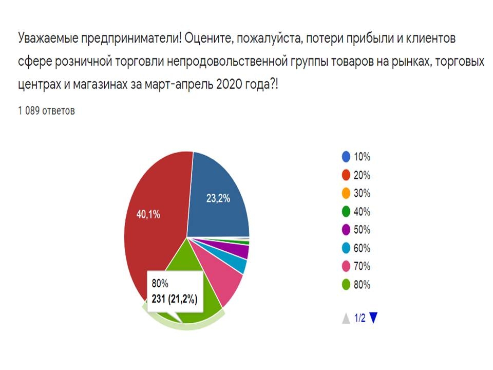 В качестве иллюстрации этого вывода "Перспектива" приводит данные собственного опроса, согласно которому потери ИП в торговле сейчас составляют 80-100%. В исследовании приняли участие более тысячи предпринимателей. Им предлагалось оценить потери прибыли и клиентов "в сфере розничной торговли непродовольственной группы товаров на рынках, торговых центрах и магазинах за март-апрель 2020 года".