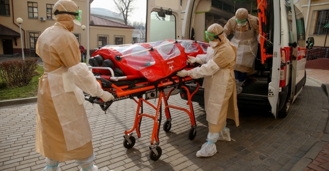 Транспортировка пациента с коронавирусом из 3-й городской клинической больницы Минска в инфекционную больницу. 27 марта 2020 года. Фото: БЕЛТА