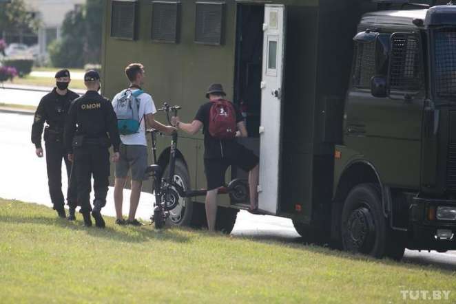 19.35. В центре города начались задержания. По информации незарегистрированного правозащитного центра «Вясна», на улице Освобождения за ТЦ Galleria был задержан Андрей Ткачев, один из координаторов инициативы BYCOVID19. Также возле цирка задержан музыкант Филипп Чмырь, он фотографировал омоновцев.