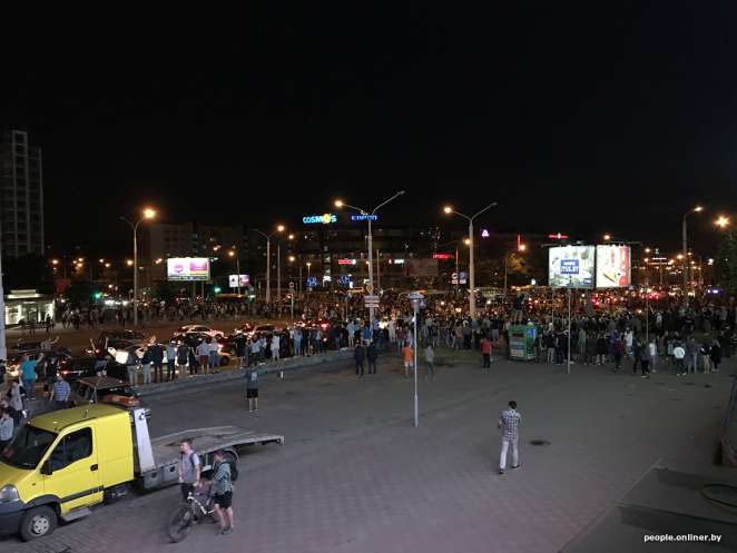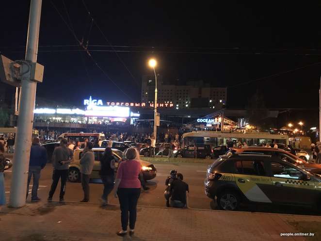 20.44. Серебрянка. Несколько сотен людей в районе «Гиппо». ОМОН тоже здесь, но ничего не происходит. Водители активно сигналят.