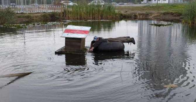 Как коммунальники доставали из пруда бело-красно-белый домик для уток