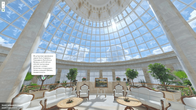 Виртуальный тур проводит по двум маршрутам через множество залов, в которых Александр Лукашенко проводит свои совещания. Однако маршруты касаются только первого и второго этажей Дворца независимости. Что же находится на третьем – так и осталось загадкой.