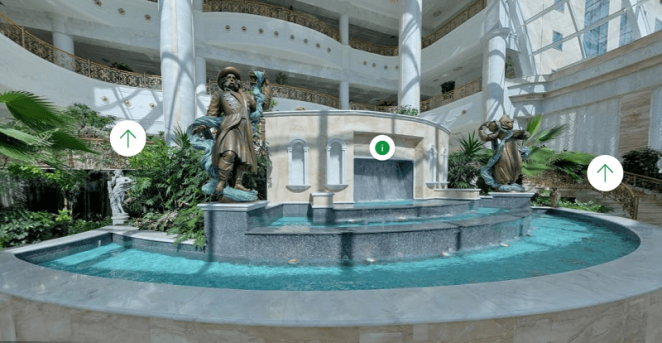 Другой интересный момент – вирутальный тур проходит через впечатляющий зимний сад с фонтаном.
